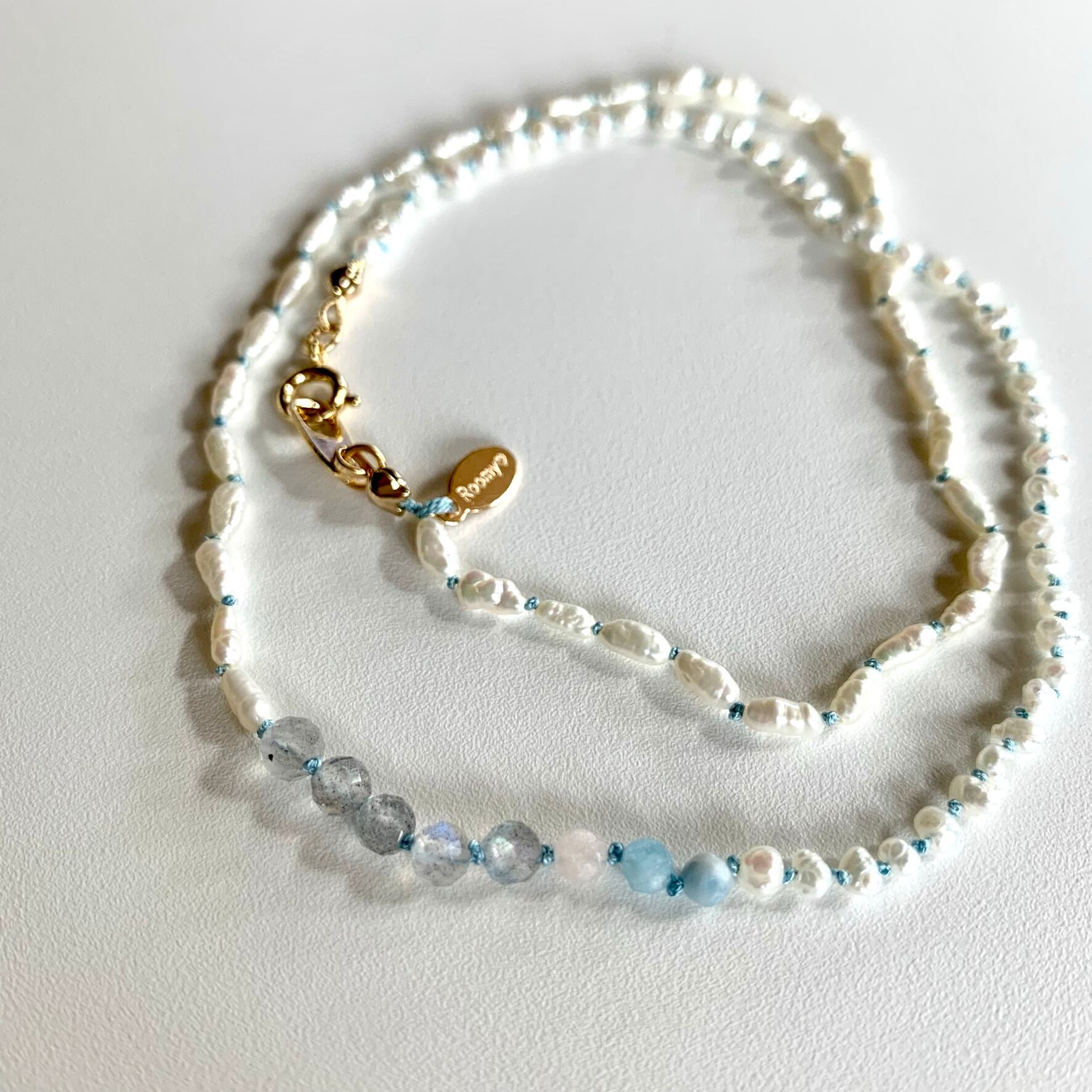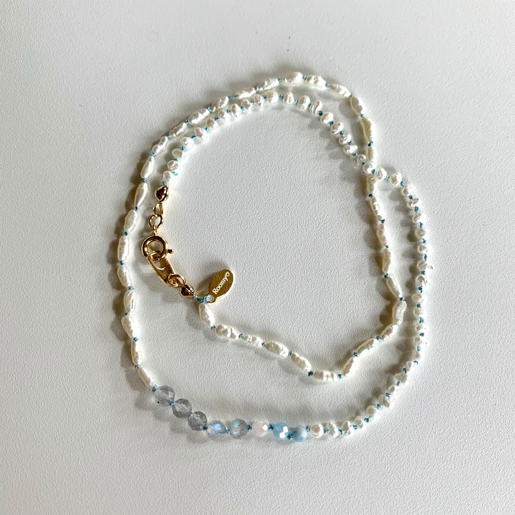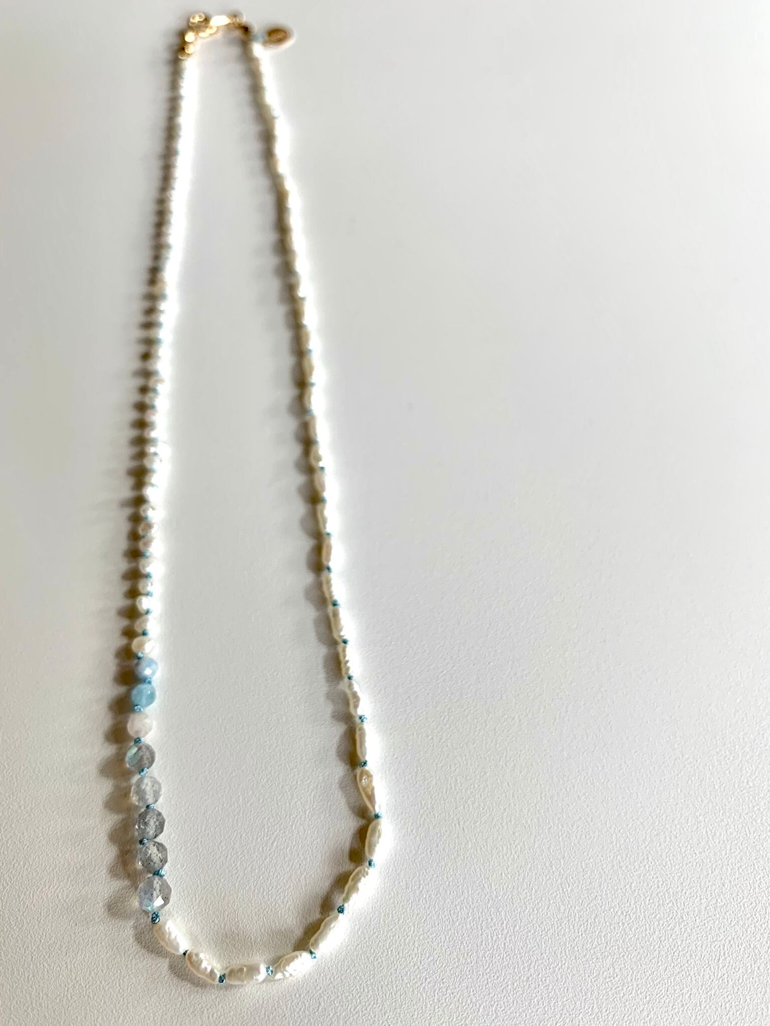小粒の淡水パールとラブラドライトとベルリを結びました。