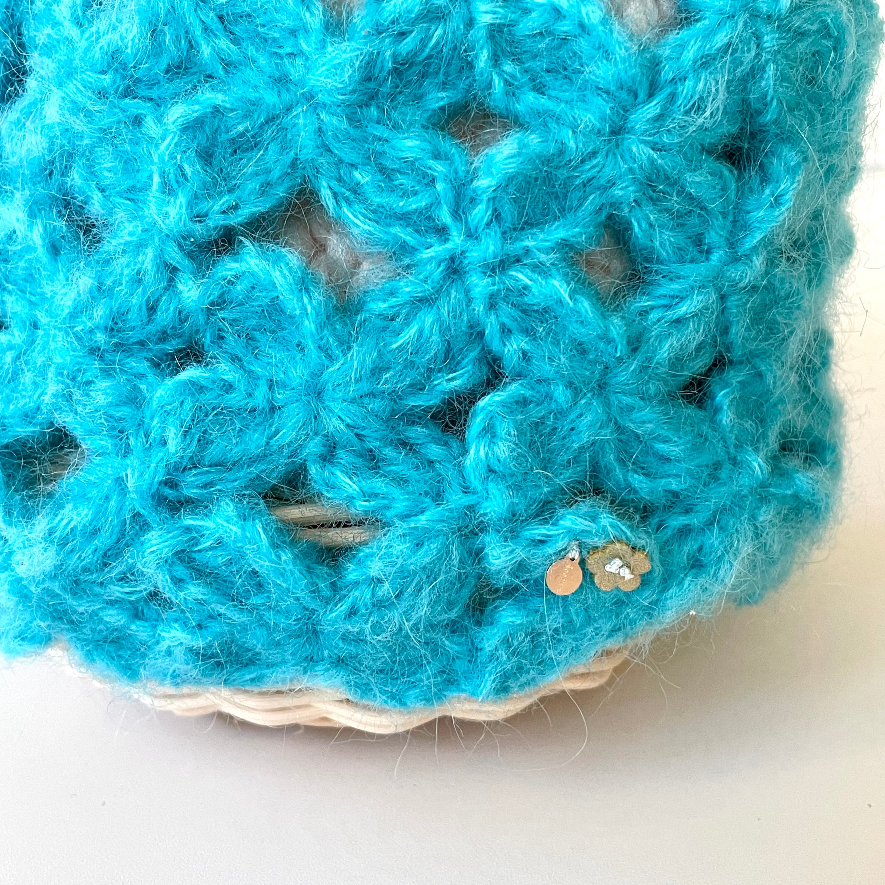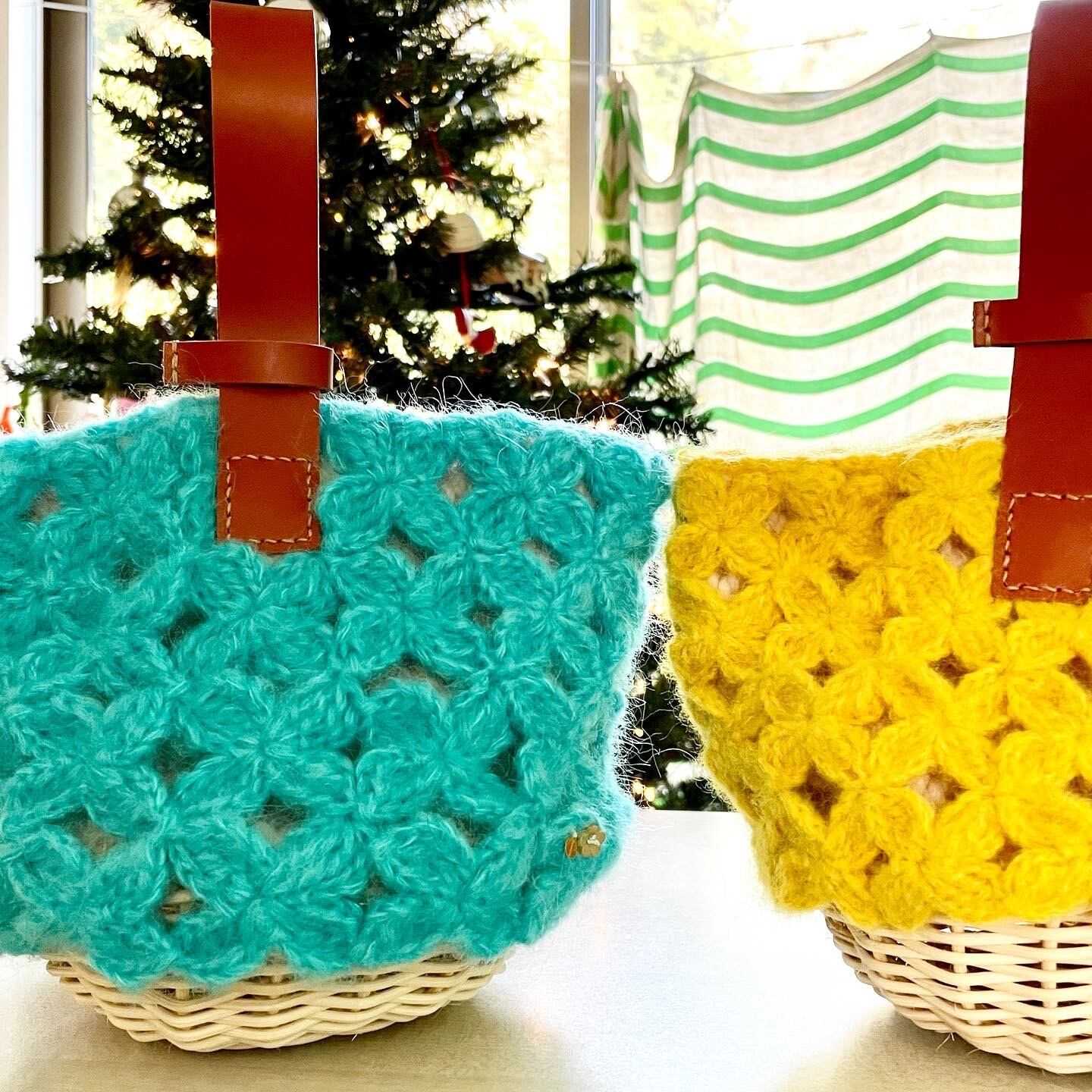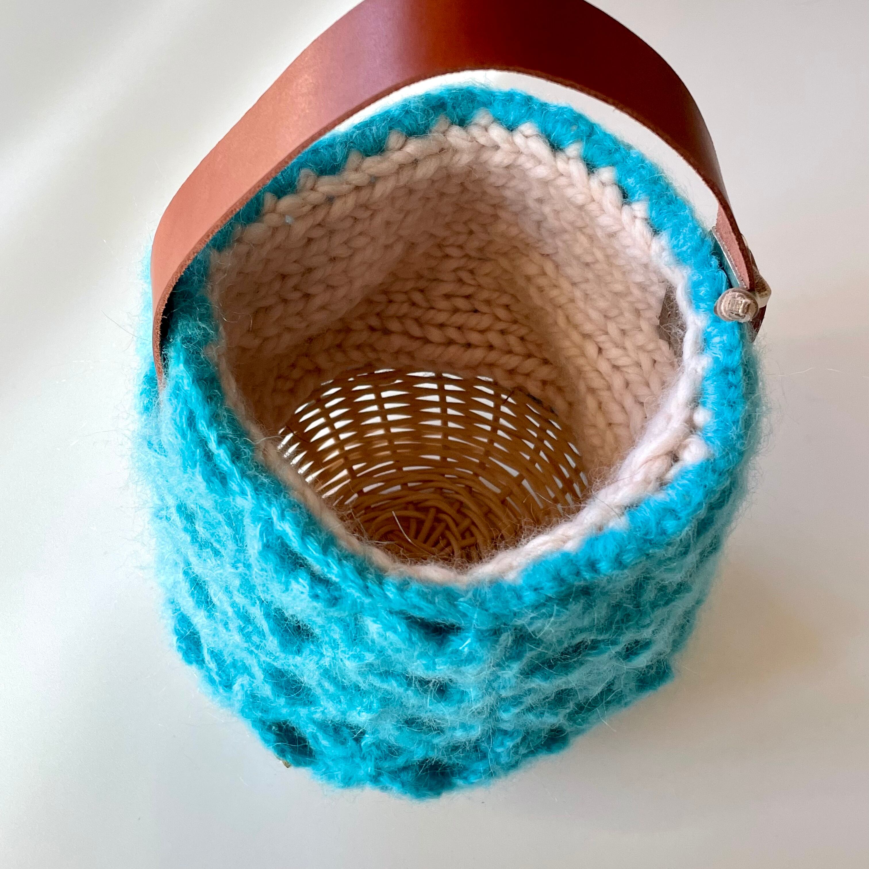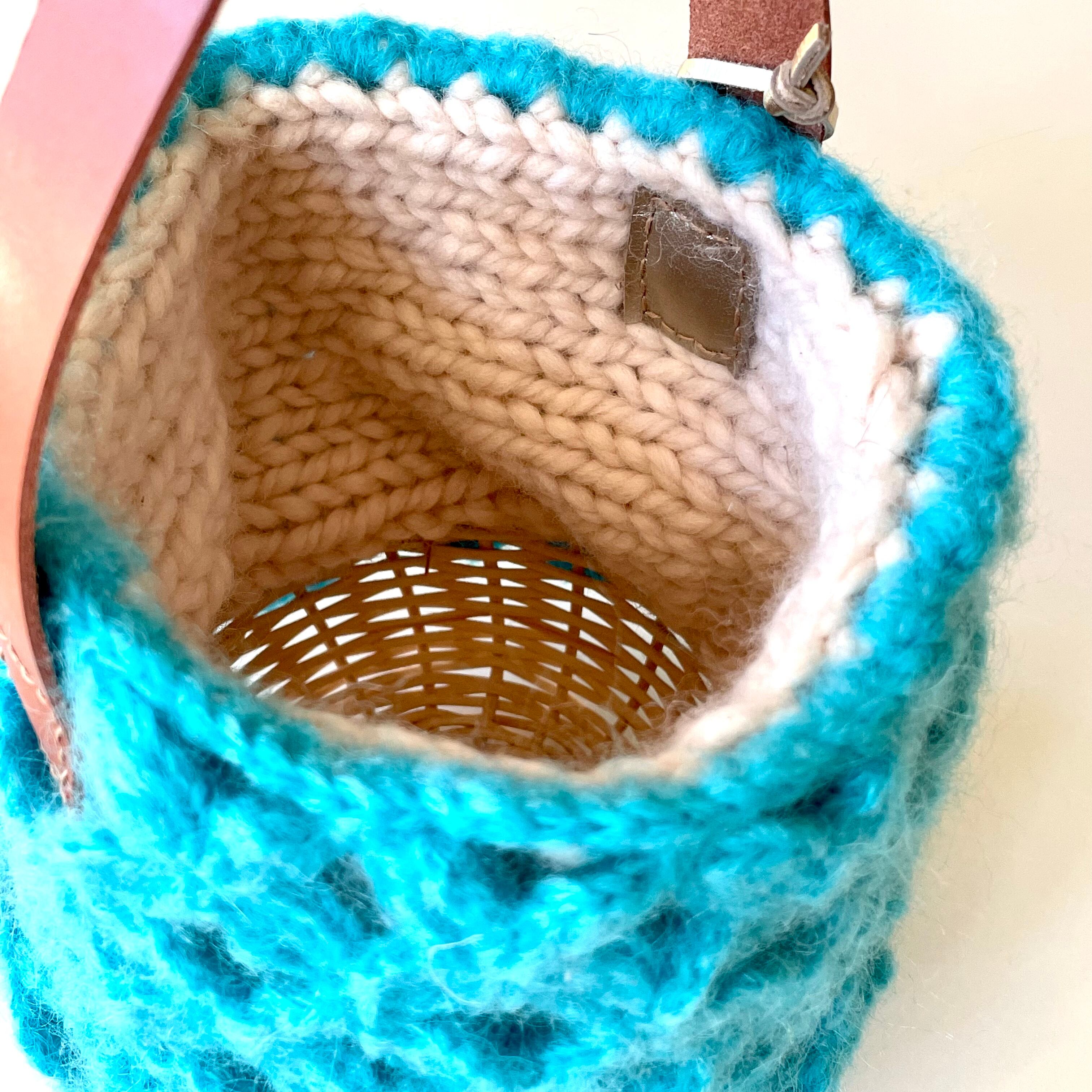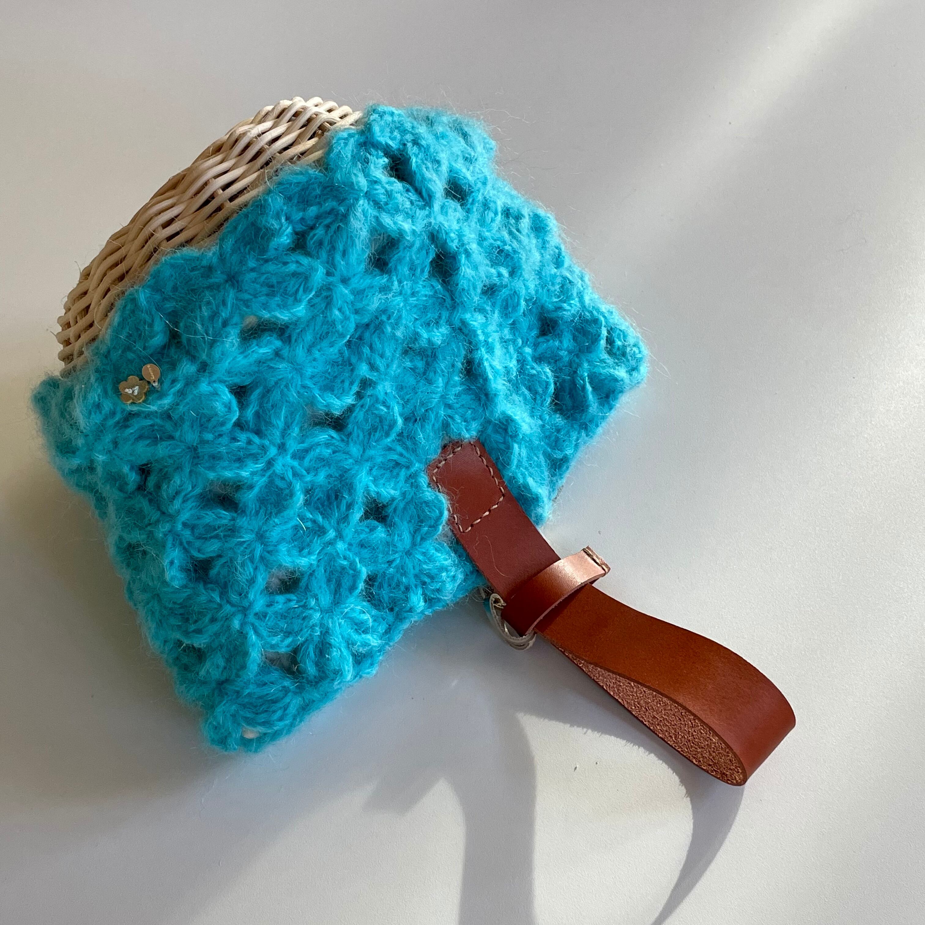 籐と毛糸を使った手編みのミニ籠バッグです。